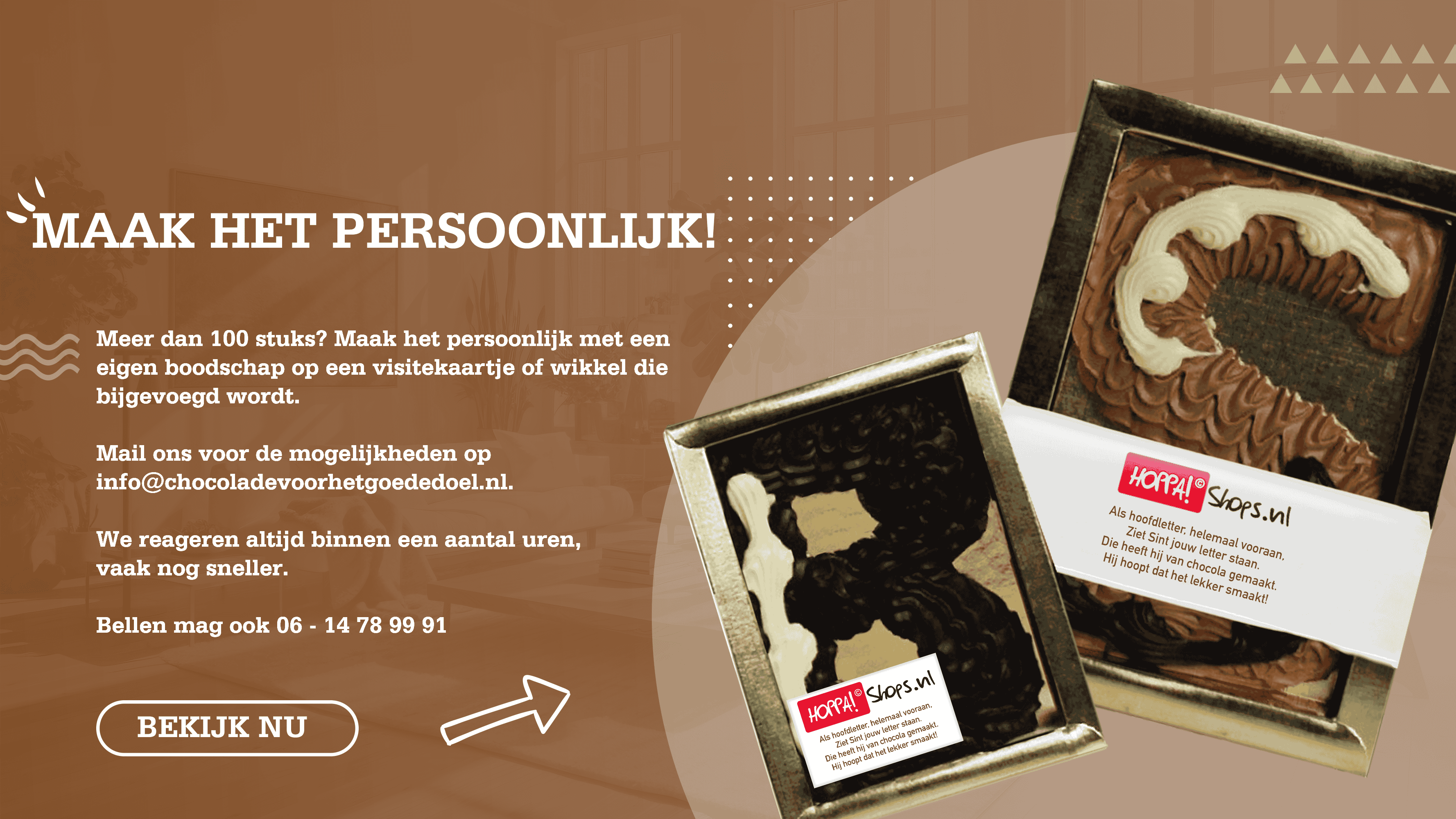 Zie afbeelding hierboven en voorbeeld op www.chocoladevoorhetgoededoel.nl hoe beide opties eruit zien, uiteraard kun je dit geheel naar eigen wijze vormgeven!