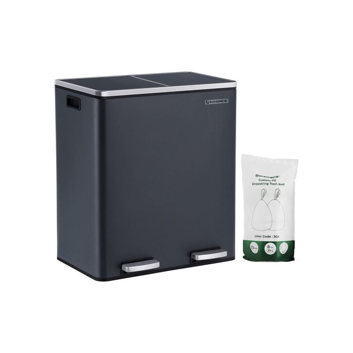 Specifications:Color: GrayMaterial: Powder Coated Steel Bin, PP Plastic Inner Bucket, ABS Plastic LidProduct Size: 23.1”L x 12.6”W x 25.6”H (58.6 x 32 x 65 cm)Inner Bucket Size: 10.6”L x 10.6”W x 23”H (27 x 27 x 58.5 cm)Total Height with Open Lid: 37” (94 cm)Total Volume: 16 gallon (60L)Product Weight: 20.1 lb (9.1 kg)Package Contents:1 x Trash Can15 x Trash BagSONGMICS Notes:Wipe clean with a soft, damp cloth and use mild detergent if necessary.