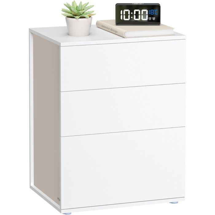 Product details: Colour: Matte White/Cappuccino Beige - Material: particle board. - Dimensions: 35 x 45 x 58.5 cm (D x W x H). - Weight: 15 kg. - Maximum load: Static load of table top: 45 kg. - Maximum load: static load per drawer: 4.5 kg. - Maximum load: total static load: 59 kg. Package includes: 1 x bedside table with drawers. 1 x Accessory Kit 1 x user manual (English language not guaranteed)