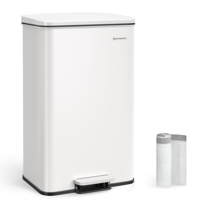 Product details: - Colour: white. - Material: Steel - Dimensions: 34.8 x 32 x 55.5 cm (L x W x H). - Total height (with lid open): 83.5 cm. - Capacity: 40 litres. - Weight: 3.3 kg. Package includes: - 1 x bin with lid. - 15 x Trash Bags