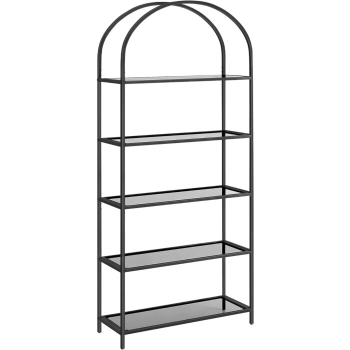 U plaatst een review over: Boekenkast 5 niveaus opbergrek van gehard glas gebogen bovenkant metalen structuur voor woonkamer slaapkamer kantoor badkamer zwart en grijs