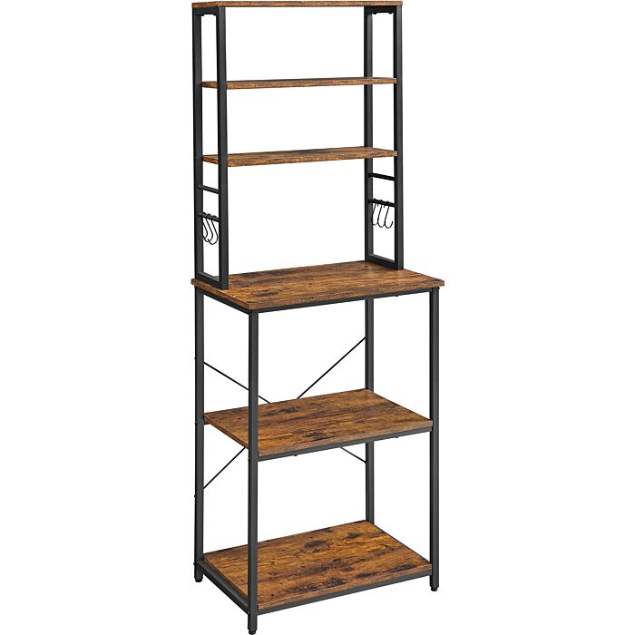 Specifications:Color: Rustic Brown, BlackMaterial: Particleboard, SteelProduct Size: 15.7"D x 23.6"W x 65.7"H (40 x 60 x 167 cm)Product Weight: 35.5 lb (16.1 kg)Max. Static Load Capacity of Each Top Shelf: 44 lb (10 kg)Max. Static Load Capacity of Each Middle Shelf: 88 lb (40 kg)Max. Static Load Capacity of Each Bottom Shelf: 44 lb (20 kg)Package Contents:1 x Kitchen Baker’s Rack6 x S-Shaped Hook1 x Anti-Tip Kit1 x Assembly Kit1 x Instructions