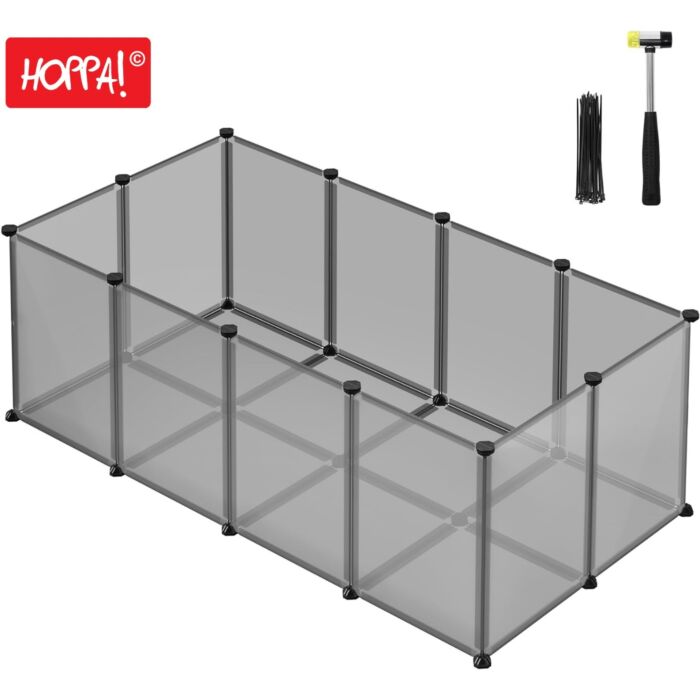 Eenvoudig te installeren: sluit eenvoudig de kunststof platen aan op de meerdere hoekverbindingen en de meegeleverde rubberen hamer om dit konijnenvrijloophuis in een mum van tijd op te zetten Ruim en veilig: dit hok biedt cavia's, hamsters, egels of konijnen een groot gebied om rond te draaien, te verkennen en plezier te hebben; de gladde 40 x 30 cm en 30 x 30 cm grote borden geven je geen kans om te buigen [Beschermende elementen] De bodem van dit buitenhok is stabiel en beschermt je vloer; de verbinding tussen de afzonderlijke kunststofplaten en de connectoren is solide en betrouwbaar, zodat kleine dieren er niet onderdoor graven en ontsnappen Verstelbaar en uitbreidbaar: het kleine dierenhok kan worden gecombineerd en L-vormig voor hoeken of worden gestapeld tot een hok van 2 verdiepingen. Voor meer informatie vindt u hieronder onze suggesties voor keuze of montage Transparant en gemakkelijk schoon te maken: dankzij de transparante kunststof platen kun je je harige kleine vriendjes altijd in de gaten houden en met ze spelen; Als het hek vuil wordt, veegt u het gewoon af met een vochtige doek