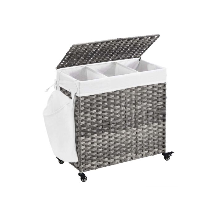 Product details: Colour: GreyMaterial: PP plastic (polypropylene), metal frame, cottonSize: 66 x 33 x 60 cm (L x W x H). Weight: 3.5 kg. Max. Static load capacity: 30 kg Box contents: 1 x laundry basket, 1 x instructions (English language not guaranteed)