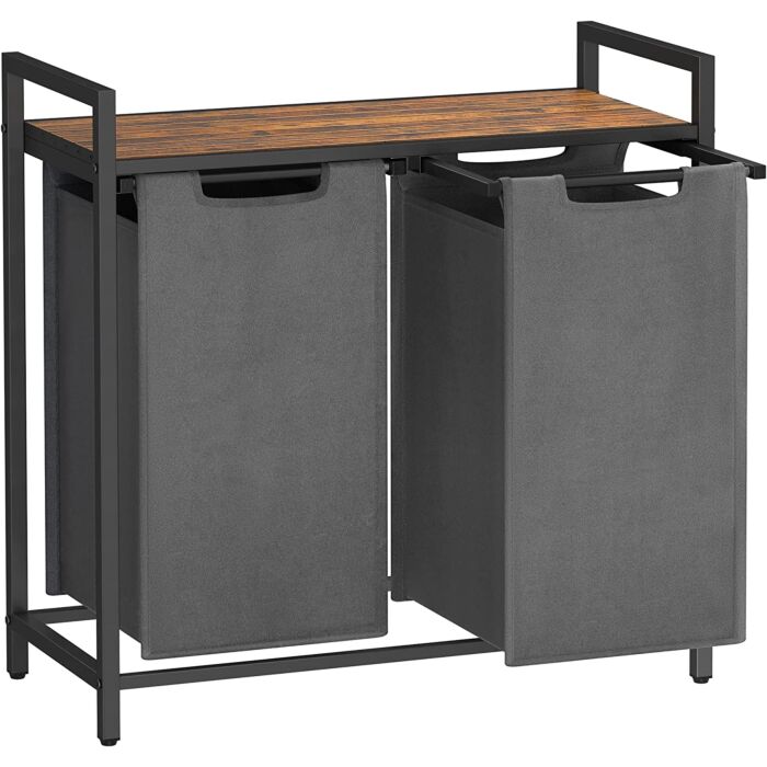 Deze wasmand biedt twee zakken van Oxford-stof om de was op kleur te sorteren, en een plank om wasmiddel en wasverzachter binnen handbereik te houden.